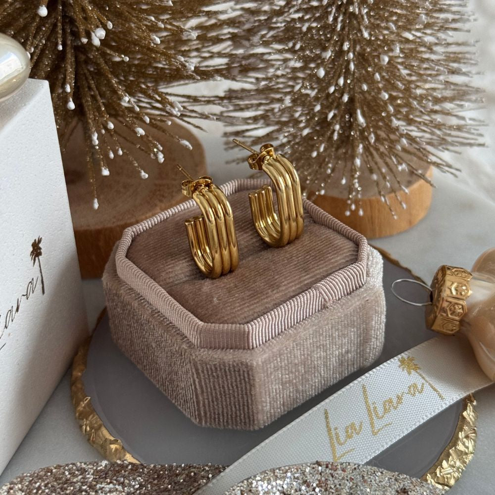 Aus Edelstahl 316L und einer 18K Goldummantelung hergestellt. Unsere Ohrringe sind wasserfest, du kannst dich darauf verlassen, dass diese Ohrringe dich überallhin begleitet, ohne an Glanz zu verlieren.